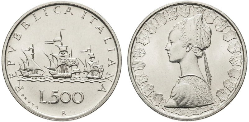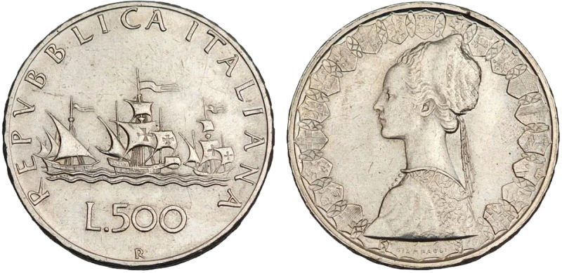 Srebrna kovanica od 500 lira, izdana krajem 1950-ih, predstavlja jednu od najpoznatijih i najintrigantnijih emisija talijanske moderne numizmatike. Nastala je u razdoblju povoljne gospodarske konjunkture, kada se Italija, nakon ratnih razaranja i poslijeratne obnove, postupno vraćala stabilnosti i prosperitetu. Ujedno je postojala i potreba usklađivanja s drugim europskim državama koje su, nakon ratne stanke, ponovno započele s kovanjem srebrnog optjecajnog novca.
