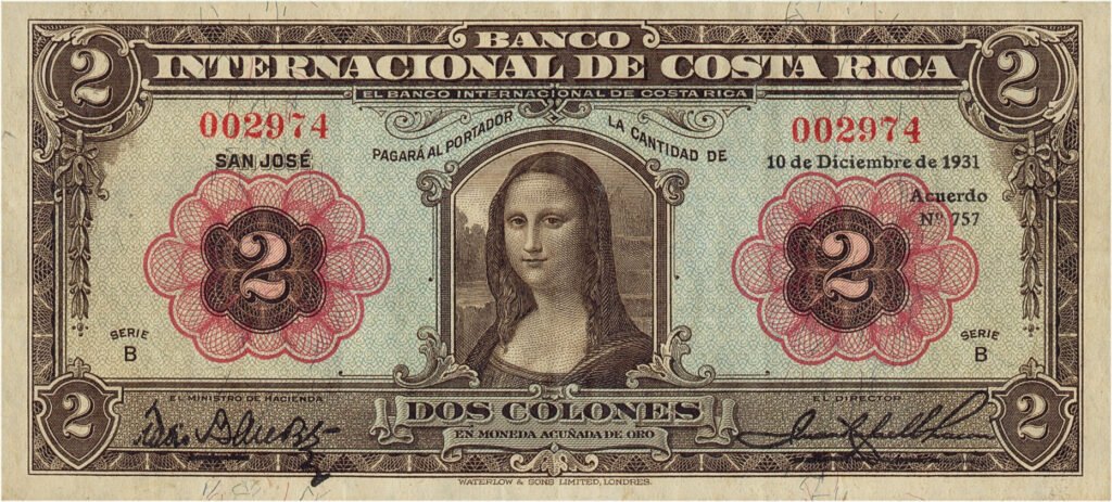 Tijekom razdoblja od 1931. do 1936. godine, Banco Internacional de Costa Rica izdavao je novčanicu nominalne vrijednosti 2 colonesa, danas poznatu pod kataloškom oznakom P#167. Na aversu ove novčanice nalazi se ženski portret koji zapanjujuće podsjeća na Mona Lisu. Iako ne postoji službena potvrda da je riječ o izravnom prikazu slavne slike, sličnost je toliko uvjerljiva da je novčanica već desetljećima u numizmatičkom svijetu poznata upravo pod tim imenom – (eng.) „Mona Lisa Note“.