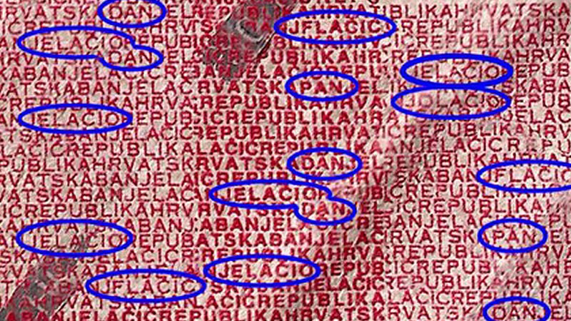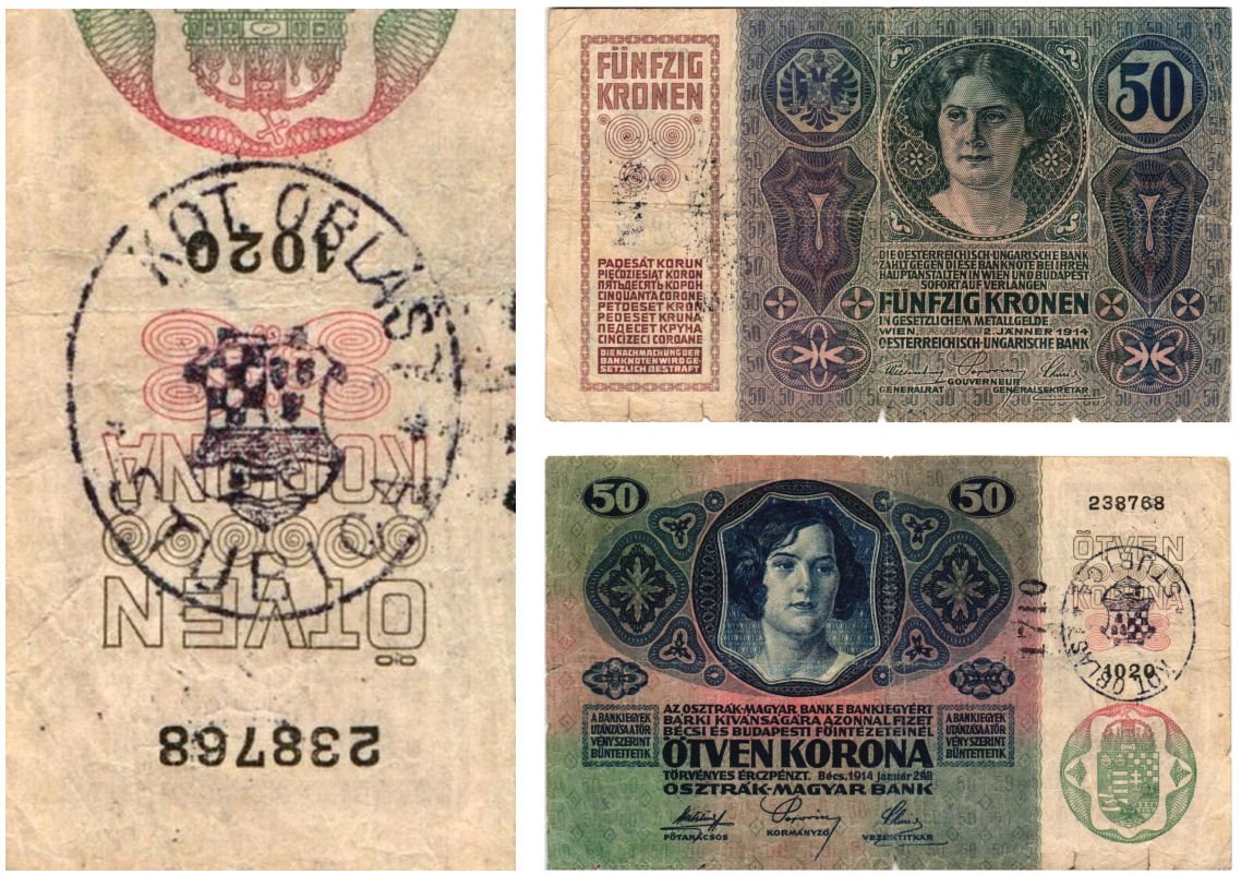Na slici je nostrificiranih austro-ugarskih 50 kruna sa žigom (pečatom) kotarske oblasti Stubica (Hrvatsko zagorje). Na žigu se jasno vidi kako su uklonjeni natpisi i elementi koji asociraju na bivšu Austro-Ugarsku.