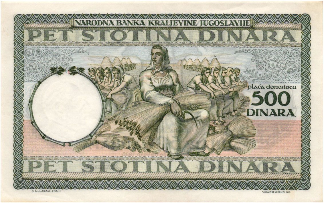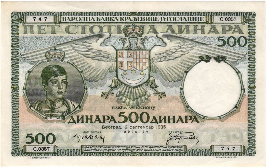 Novčanica od 500 dinara Kraljevine Jugoslavije iz 1935. godine predstavlja jedno od likovno najuspjelijih i ikonografski najzaokruženijih izdanja međuratne jugoslavenske notafilije. Cjelokupna kompozicija izvedena je u suptilnoj paleti zelenih, maslinastih i smeđih tonova, s diskretnim ružičastim prijelazima u podlozi, što joj daje profinjenu, gotovo slikarsku mekoću.