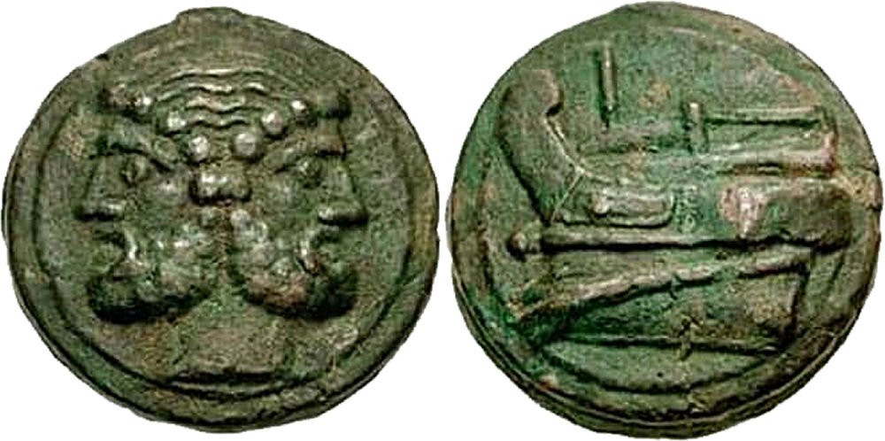 Na bakrenom novcu istoga razdoblja na aversu se nalaze glave Jana, Apolona i Dijane, dok su na reversu kod starijih primjeraka prikazi Merkura, a kod mlađih motivi kotača i konja.