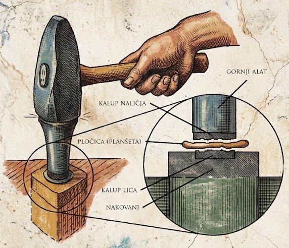 7. Udarna sila i čin kovanja. Završni i najvažniji korak bio je snažan udarac teškim čekićem po vrhu gornjeg alata.Energija udarca istodobno je utiskivala motive s oba kalupa u metal: