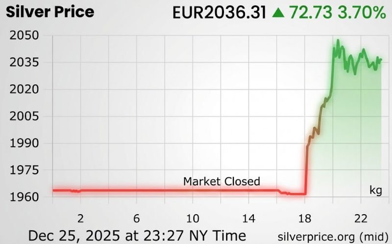 Kako su mnogi analitičari i kolekcionari već dulje vrijeme očekivali, bilo je samo pitanje trenutka kada će burzovna cijena srebra probiti važnu psihološku granicu od 2 eura po gramu čistog srebra, odnosno 2000 eura za kilogram. Upravo se to dogodilo danas, odmah po otvaranju burzi nakon božićne stanke, pa trenutna cijena srebra iznosi sada 2036,31 EUR za kilogram čistog srebra.