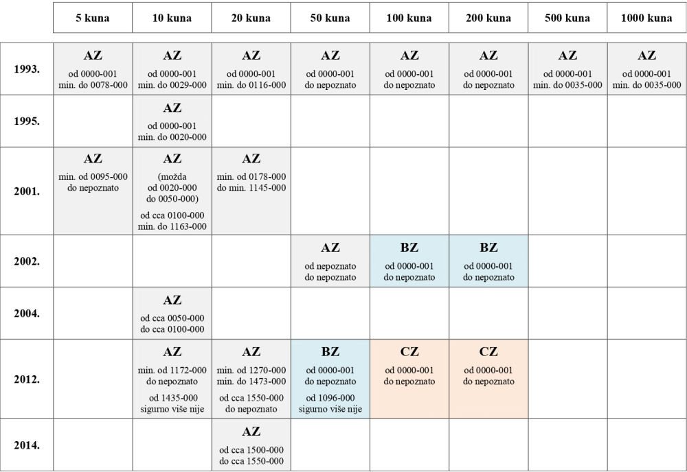 Na svim novčanicama kuna emisije iz 1993. godine korištena je serija „AZ“ kao zamjenska. Numeriranje se u toj seriji provelo samo do određenog broja na pojedinoj od tih novčanica.